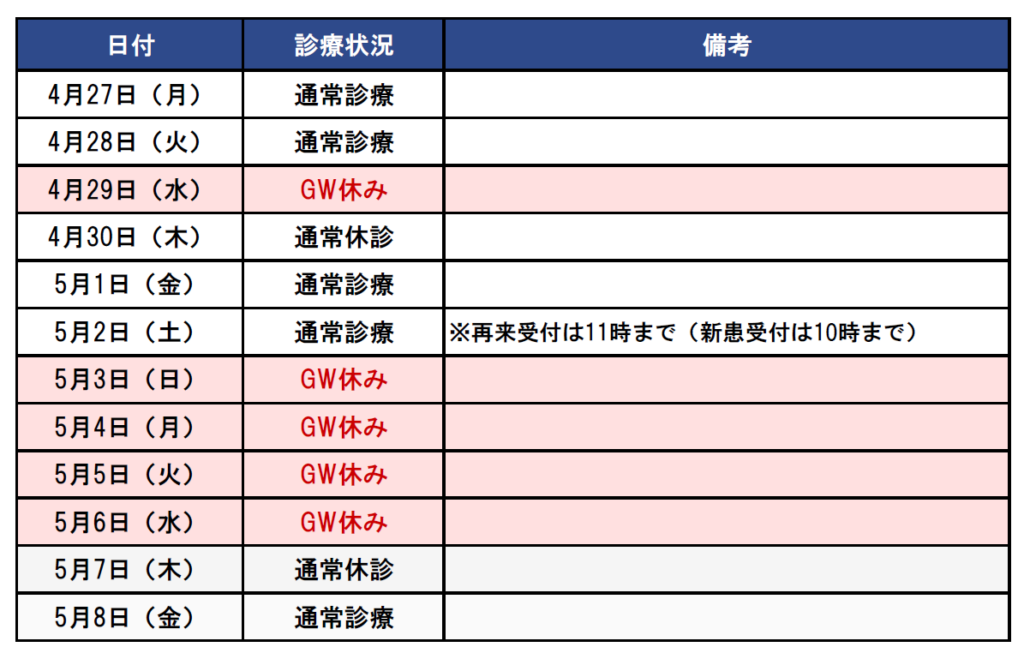 GW期間中の診療日・休診日のお知らせ
